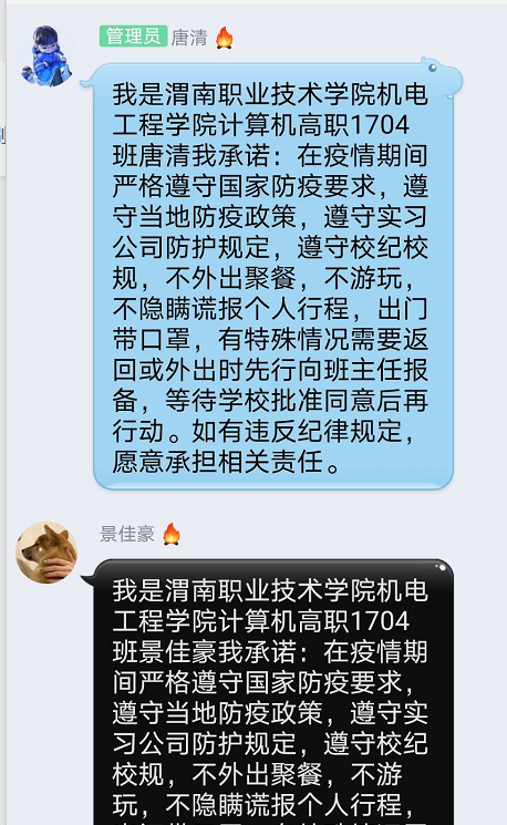 针对员工管理在政策落实方面提出三点要求:一是疫情管理工作中,监控班级员工打卡,确保每日100%打卡及数据的真实性。所有的顶岗实习员工坚守不流动的原则,如有特殊情况,及时上报公司备案,获得相关指令后方可在岗位上异动。对于中高风险地区员工逐一进行思想教育,建立员工档案,引导员工严格遵守公司的疫情管理规定和企业的管控要求,不流动不走动,确保自己的生命安全。二是4月1日前完成17级线上主题班会召开。班会中要强调员工管理及纪律要求。开展思想教育工作,提升员工的思想认识,让员工真正领会当下疫情的严重性,理解国家及公司政策的背后价值与意义,要求员工严格遵守当下的疫情政策要求,跟踪每个员工完成自律承诺书,确保将公司的政策落到实处。三是本周内各班必须要开展线上家长会。鉴于在校生在家网课学习时间较长,思想容易出现松懈怠慢。除了在每周的班会上做好员工的心理疏导工作外,还要组织家长开展家长会,希望获得家长对员工学习的认可及支持,家校配合,共同做好疫情管理及线上教学。(撰稿:威廉体育官方网站 贺峰鸽 审核:盛君国)