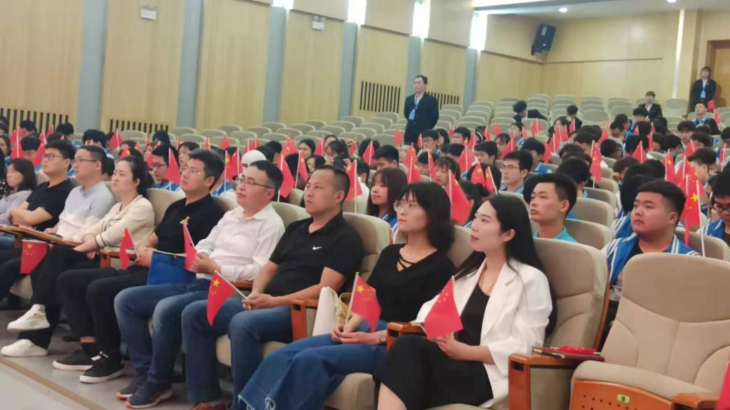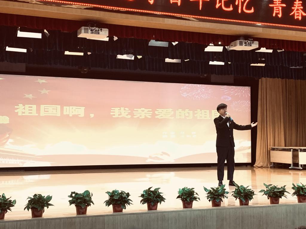 比赛伊始,全体师生手执红旗合唱《我和我的祖国》,瞬间点燃活动气氛和基调,为参赛选手奠定了良好的朗诵氛围,让歌声传递对祖国和党的热爱。