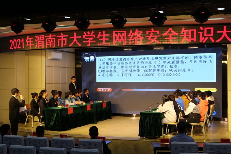 10月14日,公司威廉体育官方网站、图书馆(网信中心)共同组织本校员工参加了,由渭南市公安局主办、陕西铁路工程职业技术公司承办的2021年渭南市老员工网络安全知识大赛,此次网络安全知识大赛在陕西铁路工程职业技术公司临渭区报告厅举行,威廉体育官方网站、渭南师范公司、陕西铁路工程职业技术公司的共6支代表队参加了比赛。渭南市公安局副局长沈军 、渭南市公安局网安支队政委赵利军及渭南市网信办网络安全科科长王明涛等相关领导参加了活动。