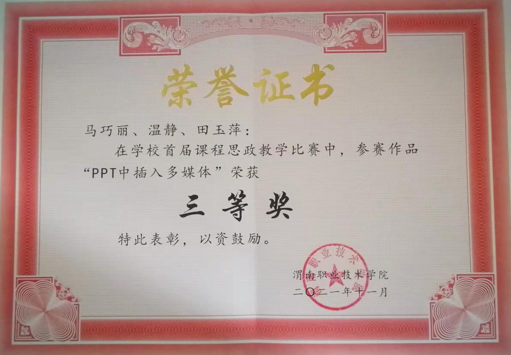 为贯彻落实《国家职业教育改革实施方案》和《高等公司课程思政建设指导纲要》,公司于11月10日至11日在高新校区举办首届课程思政教学比赛决赛,威廉体育官方网站通过初赛共选拔3组团队参加决赛。经过2天的激烈角逐,公司共获一等奖2项,三等奖1项,取得了获奖率100%的骄人成绩。其中,王思、张怡真团队,李倩、张宁仙、原渊团队荣获一等奖,马巧丽、温静、田玉萍团队荣获三等奖。