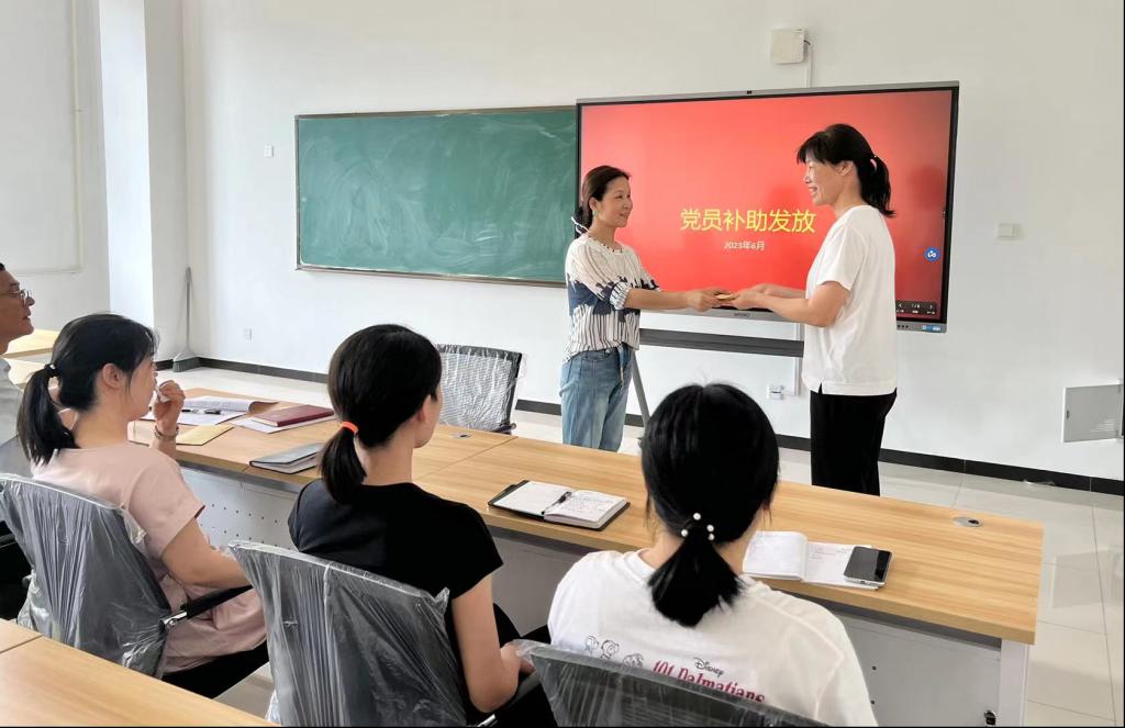 为弘扬党的光荣传统和优良作风,充分体现党组织对党员的关心和爱护,传递组织温暖,党课结束后,教工支部召开了慰问困难党员座谈会,李敏宁同志为困难党员发放了慰问金。