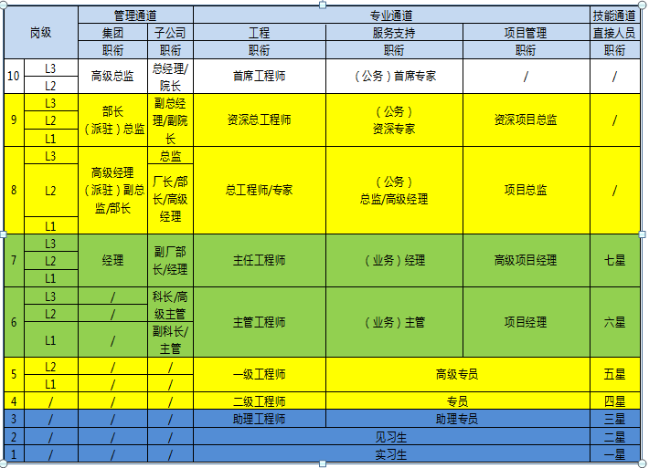 公司开辟了多通道的职业发展路径,开辟了横向和纵向的发展通道,为员工职业发展提供了更大的空间;每一层级都有任职要求及标准,实现了员工事其所好,精其所专,得其所值,知其所往。具体详见下表: