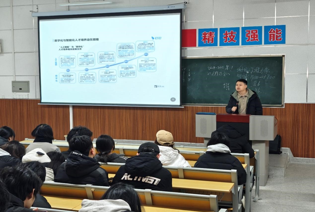 为加强公司信息技术类专业建设,培养更多的数字化人才,满足产教融合需求,深入了解数字化产业发展及人才需求变化,帮助公司员工更好地了解信息类专业的发展趋势,明确未来职业规划。1月8日,威廉体育官方网站在综合楼409教室举行“智能制造行业数字化人才发展现状与未来趋势”报告会,特邀陕西数域数字技术有限公司软件工程师白海龙主讲,2023、2024级计算机应用技术、大数据技术、人工智能技术应用专业同学参加。